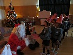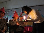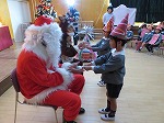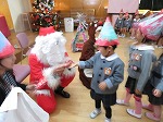 「サンタさんは何歳ですか?」「どこから来たの?」「プレゼントはどうやって作るの?」と質問した後、大きな袋からプレゼントを一人一人もらいました。「メリークリスマス」「ありがとう」と言えました。