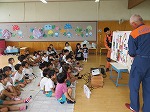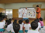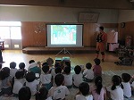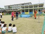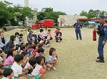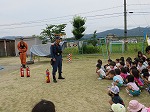 6月22日 幼稚園に消防士さんが来てくださり、防火教室をしました。避難訓練の様子をみていただき、上手に避難できたことをほめてもらいました。火事を見つけた時に使う消火器の訓練を先生たちがしました。「がんばれー」のみんなの声援で火を消すことができました。