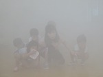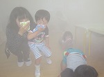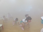 煙体験もしました。「うわぁー!モクモク煙で見えない!」と言うと消防士さんに体を低くして歩くと見えることを教えてもらいました。