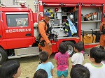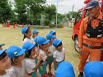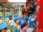最後に消防車を見せてもらい、消防士さんに消防車についていろいろ教えていただきました。「これは何?」「ここから何がでるの?」などなど積極的に質問する姿が見られました。