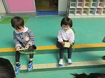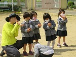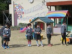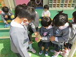 新入園児歓迎会(4月22日) 園庭にて、新入園児歓迎会をしました。  うさぎ組さん、すみれ組さんに新しいお友達が加わりました!新しい先生もたくさんいますよ!みんな、もう覚えてくれたかな?園長先生のお話を聞きました。  ゆり組さんが司会進行をしてくれました。プレゼントを紹介したり、歌を歌ったり、大忙しです。  プレゼントをもらって、嬉しそうに見つめています。うさぎ組さんには「お散歩バック」、すみれ組さんと新しい先生には花束のペンダントを渡しました。プレゼントを作ってくれたのもゆり組さんです!  これから一緒にいっぱい遊ぼうね!