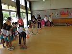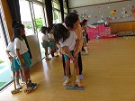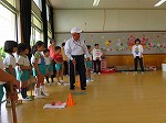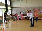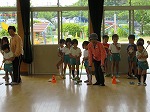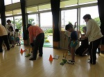 5月23日年長ゆり組は地域の方(田辺団地連合自治会の方)にグランドゴルフを教えてもらいました。園にパターはあるものの、「どうやって遊ぶの?」「グランドゴルフってどんなの?」と教えてもらえることを楽しみにしていました。「よろしくお願いします」とご挨拶して、まずはお手本を見せてもらいました。「すごーい!」