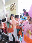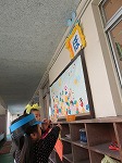 宇宙人からカードが届き、年長・年中・年少の3人組になって「か」「ぼ」「ちゃ」の文字を探したり、かぼちゃオバケを探したり…園長先生とぎゅってしよう!教頭先生と挨拶をしよう!服部先生とタッチしよう!えびのお寿司を探そう!と書いてあって、みんなでワイワイ探しました。