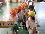 うさぎ組の子ども達にとっては、初めての運動会。手作りの望遠鏡を持って散歩を楽しみ、トンボやライオン、カエルなどいろいろな生き物に変身して遊んだり、おうちの人と一緒に♪どんぐ~り~ま~ん♪と歌いながら、楽しく踊りました。また、「はじめてのおてつだい☆」の親子競技では、お家の人との触れ合いも楽しみながら遊ぶことができました。