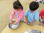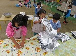 「いいにおいがしてきたね」「おなかすいてきた」もっともっと焼けるようにうちわを作ってパタパタあおぎました!「ほら!いっぱい燃えてきた」♪やきいもやきいもおなかがグー~と口ずさみながら焼けるのを待っていました。
