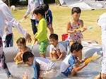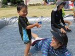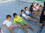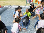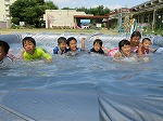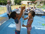 7月24日・25日・26日は登園日です。初日の24日も元気いっぱい登園してくれました。田辺団地自治会の方々が暑い中、子どもたちのために大きなプールを作ってくださいました。いつもと違う大きなプールを早速見つけて、「ここに入るの?」「おおきいなー」と朝から大喜びの子どもたちでした。
