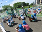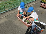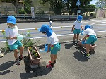 京田辺市公共サポーター活動(緑化推進事業)で5歳児ゆり組の子どもたちが、幼稚園門前広場にマリーゴールド・インパチェンス・ペチュニアの花の苗を植えました。