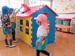 ホールや保育室も案内してくれました。ゆり組さんも、うさぎ組さんのお部屋に興味津々。