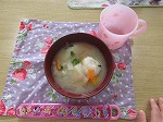 お昼はお雑煮にしていただきました。みんなで育てた大根、大根葉、かぶ、さつまいもも入っています。「おいしいね」「おかわり!」おなかいっぱい食べました。