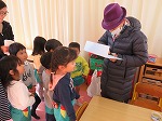 いつも田辺東幼稚園の子どもたちのことを思って、まつぼっくりやザクロ、渋柿など届けてくださる藤井さん。子どもたちと話をし、「いつもありがとう!」「ザクロの絵を描いたよ」「まつぼっくりでクリスマスツリーを作っているよ」「柿ありがとう」と手紙と絵を描きました。とっても喜んでくださり「ありがとう。また持ってくるから待っててね」と話してもらいうれしそうな子どもたちでした。