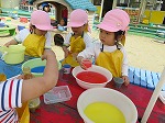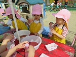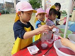暑い日も出てきて、園庭では色水のジュ―ス屋さんがオープン!!初めての色水遊びに大喜びの年少うさぎ組です。