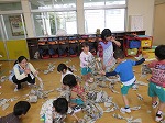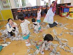 お部屋では新聞遊びもしました。ビリビリ破って、「わーい」と投げて遊んだあとは、みんなで袋いっぱいに新聞紙を詰めました。