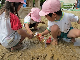 ヌルヌル、ベタベタ、ツルツル、サラサラ、冷たさや気持ちよさなど色々な感触を友だちと感じ取り心に積み重ねていきます。