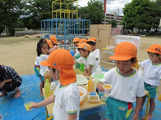 水を運んだり、土粘土に水を混ぜたり、えのぐ遊びの後はジュースやさんが大繁盛です。