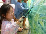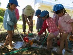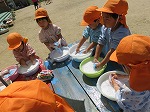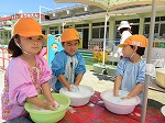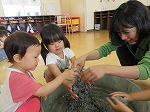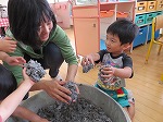 年少組は新聞ビリビリ楽しんだ後、水を入れて新聞粘土にし、感触を楽しみました。