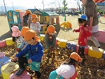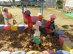 12月7日 昨日から冷たい風が吹いて、落ち葉でいっぱいになった砂場。「おはよう」と元気に登園するとすぐに気づいて「早く遊びたい」と着替えを済ませて遊びはじめました。「落ち葉のおふろやな」「落ち葉のプールやで」「かさかさ言うね」「きもちいいなー」