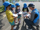 ゆり組さんが、ウォークラリーの地図を見て考えています。「小学校に行くんだよね」「どこから入るのかな?」「知らない先生のお名前が書いてあるよ」