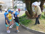 用務員さんに出会いました。「何をしているんですか?」「みんながケガをしないように、伸びているところを切っています」「チクチクして痛いんですよ」「ここに、種があります。種はこんなのです。」一つすつ、種をくださいました。