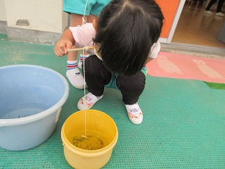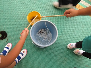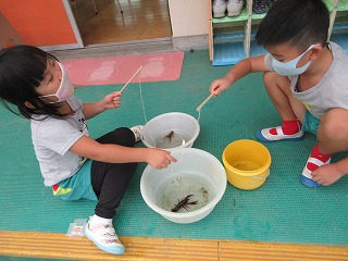 緊急事態宣言が発令されたため、園外へのお散歩が中止なったので、幼稚園でザリガニ釣りをすることにしました。