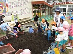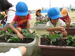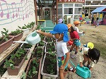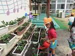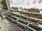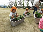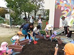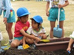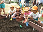 有志で集まってくださったお母さんたちも手伝ってくださり、みんなでプランターに土を入れました。幼虫発見!!「これ、カブトムシかな?」「飼いたい」「ダンゴムシもいる」自然に触れ合うことができました。