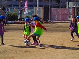 4歳児は元気一杯コーチにからみ、5歳児はチームの勝ちをねらう気持ちが芽生