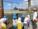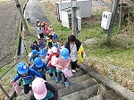 登園の時間はまだ雨が降っていましたが、雨があがりお日様もでてきて、みんなで散歩に行きました。小学校の横を通って、階段を上がって木津川堤防広場まで歩きました。春はこの階段がなかなか上がることができなかった年少さんも、今日はしっかり歩くことができ、一年の成長を感じました。