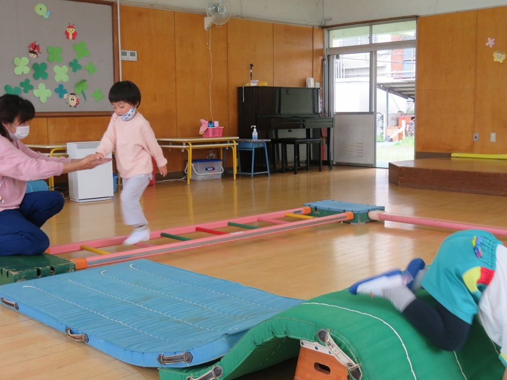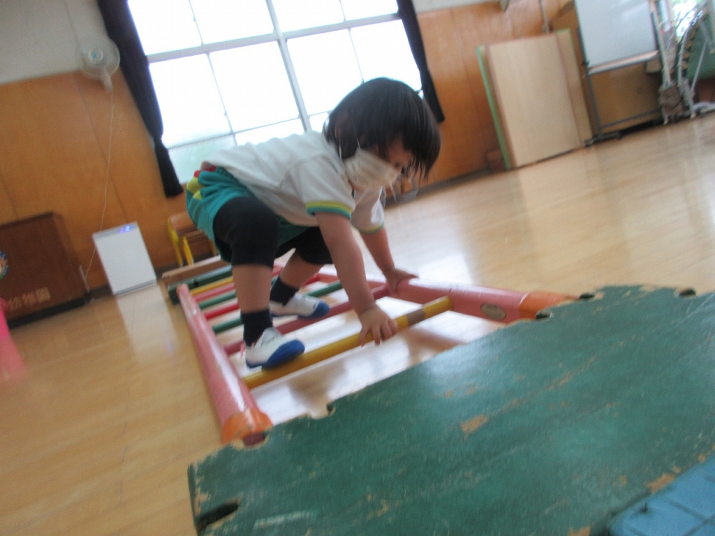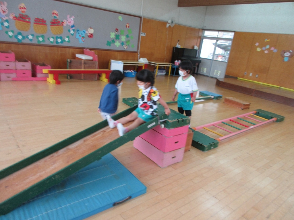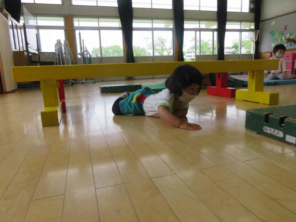 一本橋を渡ったり、滑り台を滑ったり、平均台をくぐったりして楽しんでいます。