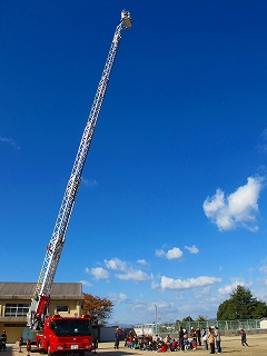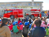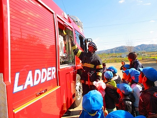 いつもは幼稚園の中だけの火災避難訓練。今日は小学校のグランドまで避難。校長先生や消防士の方の話を聞いたり、救出訓練を見学。新型はしご車LADDERにも触れ大興奮でした。
