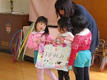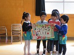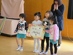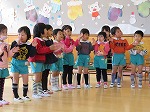 「大切にするよ」「ありがとう」と大喜びのゆり組でした。「今日は素敵なお別れ会を開いてくれてありがとう」「一年生になってもがんばります」という気持ちをこめて歌のお礼をしました。そしていつまでも忘れないでね!と修了記念製作をプレゼントしました。
