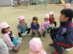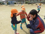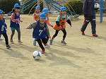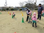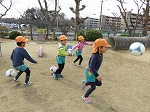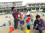 年少うさぎ組は、たくさんの三角コーンを手で倒していくゲームをしました。どんどんコーンをおこしていくコーチに負けないように、倒れているコーンを見つけて早く倒していました。「ルールを守って楽しくゲームしようね」とスポーツの基本をコーチに教えてもらいました。
