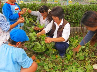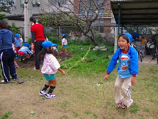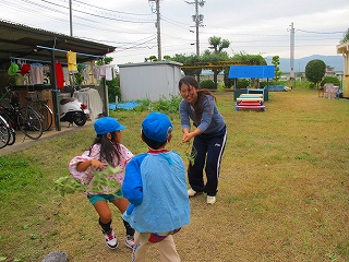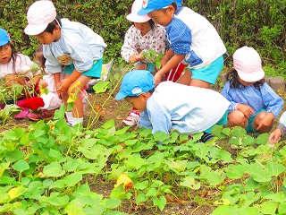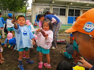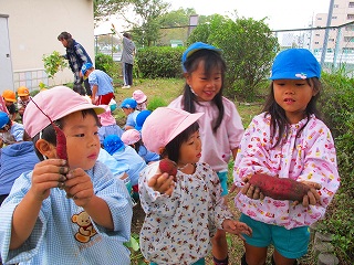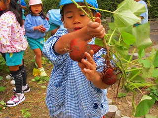 待ってました!幼稚園の畑でお芋掘り。芋のつるをひっぱってスタート。「うわぁ」「みてみて」とあっちからこつちから大歓声。小さくても自分の掘ったお芋が一番。芋のつるでつなひき、なわとびも。芋掘りが終わっても土いじり。その日のうちにふかし芋を会食、お芋のつるもお料理してもらい初めて食べた子どもたちです。