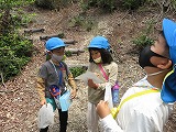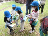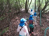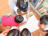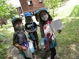 みんなで一緒に探検に出発!木の実や小枝を探検バックに集めながら、地図をみてゴールを目指します。「こっちじゃない?」「ぼくはこっちだと思う。」とそれぞれ感じたこと、思ったことを話しながら歩きます。
