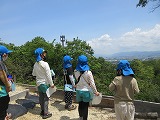 上まで登ると、家があって一休み。きれいな景色を見渡し、「やっほー!」「神様きたよー!」と大きな声で叫びます。静かにすると、鳥の声、風の音などいろいろな音が聞こえてきました。