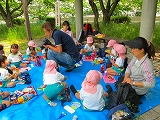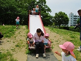草花に親しみました。公園では大きなすべりだいに大喜び。お弁当はみんな