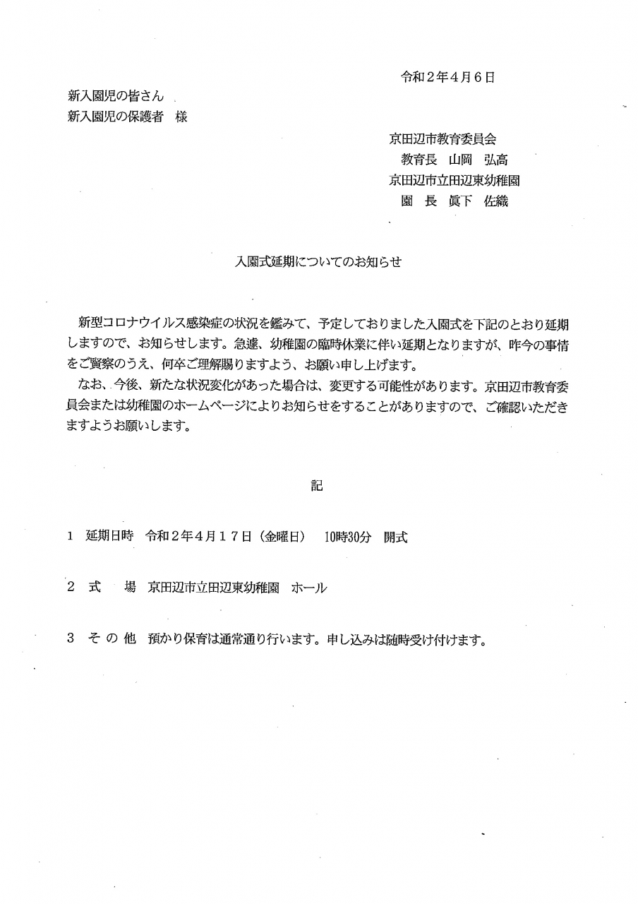 入園式延期についてのお知らせ