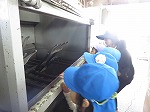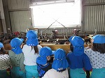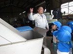 「京田辺のお茶は昔は手で揉んでいたよ」「手で揉むのと同じ製法でここで玉露にしています」と教えてもらいました。大きな機械、見たこともない機械ばかりで興味津々の子どもたちでした。「この機械で乾かして…この機械で押さえて細くするよ」等、一つ一つの工程を教えてもらいました。