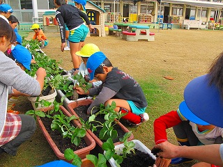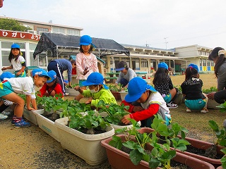 年長児がイチゴの苗植え。来年も一杯なるといいね。思いをこめて土をかけた子どもたち。