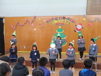 田辺東小学校の5年生からもらった帽子を被り、クリスマス会がスタート!