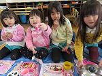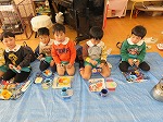 今日はお弁当最後の日。年長ゆり組は幼稚園最後のお弁当となりました。ゆり組のお友だちが「みんなで一緒に食べよう」「ゆり組で一緒に食べよう」と誘ってくれ、みんなで円になって食べました。「みんなで食べたらおいしいね」