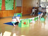 「エルマーのぼうけん」のお話が大好きな子ども達。お話をイメージしながら、いろいろな登場人物になって表現したり、巧技台やロープを使って体を動かして遊ぶ遊びにも、「この川どうやって渡ろう、ワニがきた!」など取り入れて遊びました。
