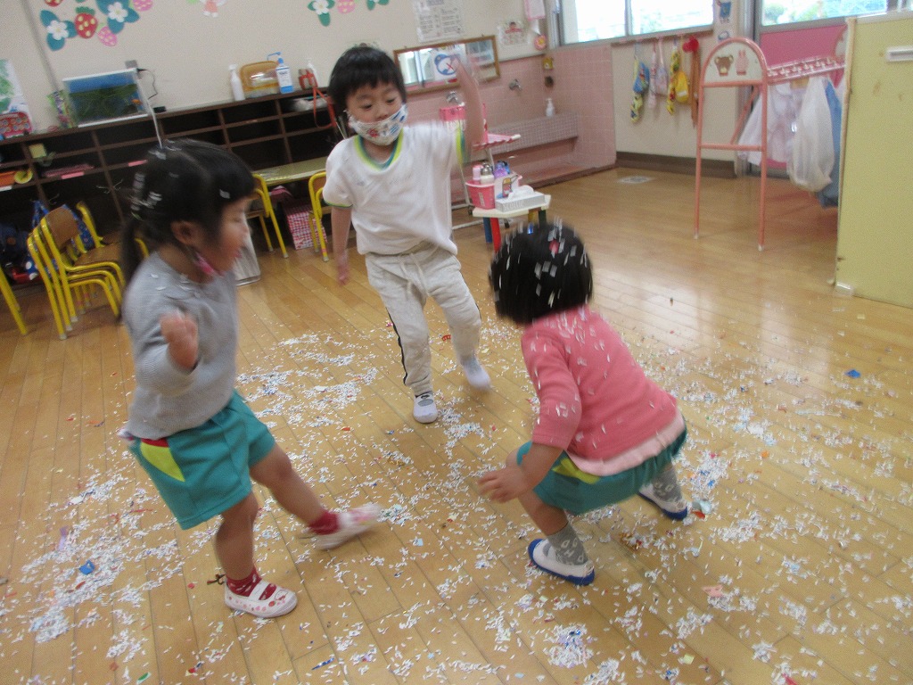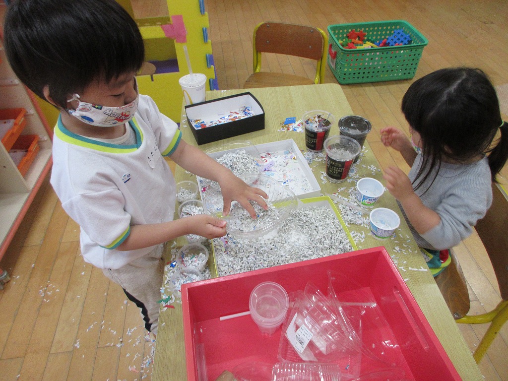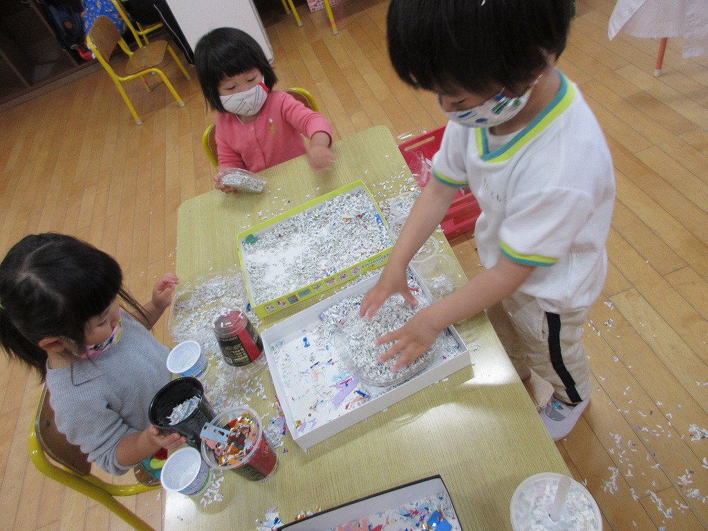 シュレッダーの紙くずも子ども達にとってはとても楽しい遊びの素材になりました。