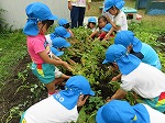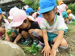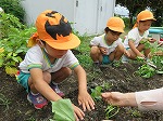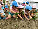 そして、サツマイモの苗を植えました。「こうやるねんで」と年長児が初めて植える年少児に優しく教える姿が見られました。「葉っぱハートみたい」「これおいも?」と発見を楽しんだ年少組でした。