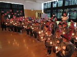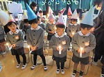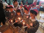 12月12日 田辺東幼稚園にサンタクロースが来てくれました!園長先生から先生達へ。先生達から子ども達へ。ろうそくの火をまわし、キャンドルサービスをしました。いつものホールがろうそくの光りに包まれて幻想的な雰囲気になりました。