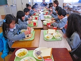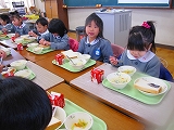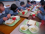 初めての給食体験、年長児は学校へ。ちょっぴり野菜が苦手な子もパクパク