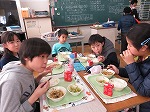 今日のメニューは「ごはん・牛乳・水菜と油揚げのすき焼き煮・茎わかめの酢の物」でした。「おなかすいたー」「おいしそう!」「はやくたべたいなー」と給食を前にワクワクしていましたよ。「いただきます!」待ちに待った給食を食べ始めると、お兄ちゃん、お姉ちゃんと会話も弾み楽しく&おいしくいただきました。
