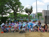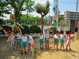 「でーきたできたっ」こいのぼりさん、そとに行こう。一緒に走って一緒に遊んで、嬉しいね、大好き。年長組のこいのぼりが大空に舞い、みんなのこと、お祝いしてるよ。