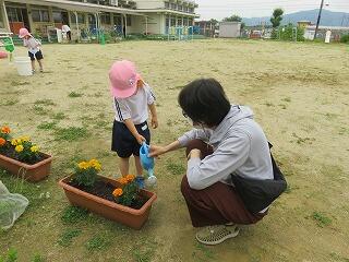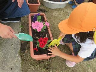 今日は苗を親子で植える日。いろどり取りの花を選び丁寧に植えていきます。