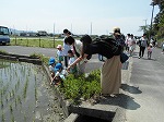 ネイチャーゲームも取り入れ、地域の自然に触れながら、親子でウォークラリーを楽しみました。生き物や農作物を見つけたり、堤防に上がって地域の景色を見たり…親子でいろいろな発見がありました。