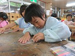 「すごいツルツルになった!」「さわってみて!」と嬉しそうに見せてくれました。「なんか緊張するなー」と言いながら、気持ちを込めて絵を描きました。