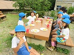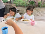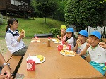 2日目の朝、雨があがり外で朝ご飯を食べることができました。「おいしいね」「おかわりある?」自然の中で食欲も増しました。